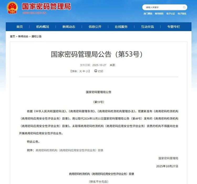 近日,國家密碼管理局發(fā)布《國家密碼管理局公告(第53號)》,公布最新《商用密碼檢測機構(gòu)(商用密碼應用安全性評估業(yè)務)目錄》,盛通檢測持續(xù)入選該目錄。